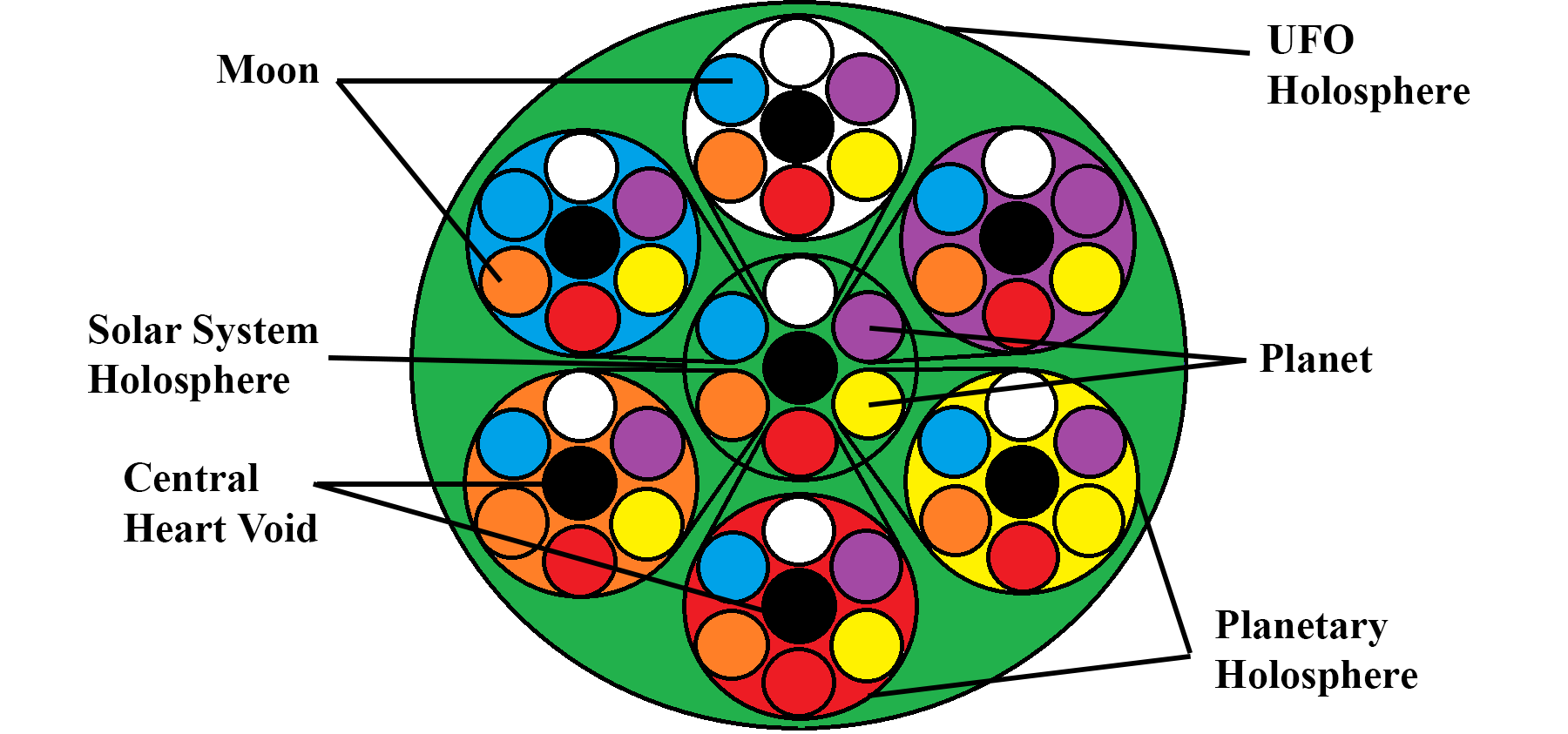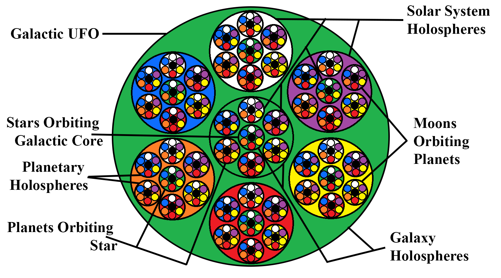 In any system of any size, the innermost Holofields are always considered the Moons. The Moons will always orbit Planets and thus be considered Planetary Holospheres. Planets will always orbit Stars, and thus be considered Solar System Holospheres. Finally, Stars will always orbit Galactic Cores (GC’s) and thus will be considered Galactic Holospheres. If an organization is larger than a Galaxy, it can expand to a Galactic Cluster and a Universe, wherein GC’s will orbit Galactic Cluster Cores (GCC’s) and GCC’s will orbit Universal Cores (UC’s).