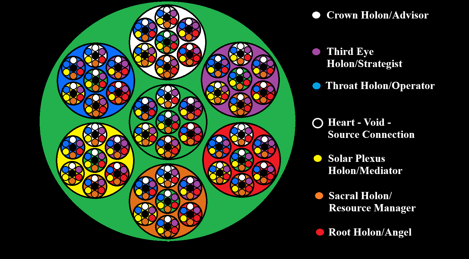 Rather than names, Holons are typically numbered, but for the sake of familiarity and to avoid confusion, I will name each Holon after their respective Chakra. The following, then, is a basic description of the role of each Holon in a Mastermind: